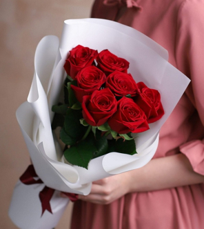 Потрясающий букет из белых анемонов с добавлением пионовидных роз Бомбастик, альстромерии, сиреневой сантини и эвкалипта.